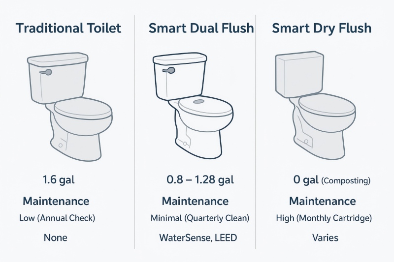 In contrast, smart dual flush toilets use water but do so with high efficiency. They are designed for mainstream residential and commercial use, offering significant water savings (verified 35% reduction versus conventional toilets) with minimal maintenance---primarily periodic sensor cleaning.